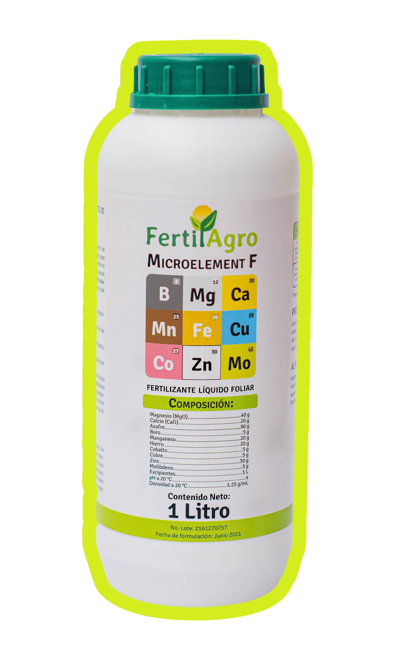 Indicado para favorecer la producción y combatir el estrés mediante el aporte completo y balanceado de microelementos de asimilación rápida y fácil. Permite corregir deficiencias en la nutrición debido a suelos agotados, con baja capacidad de intercambio catiónico (CIC), pobres en materia orgánica o en aquellos donde se retienen los nutrientes. Estos nutrientes son esenciales para absolutamente todos los procesos desde la germinación hasta la producción final, a pesar de la fertilización al suelo con NPK no se alcanzará la máxima producción sin el uso de un combinado de microelementos. Microelement F aporta de forma óptima todos los micronutrientes quelatados con ácidos policarboxílicos de origen natural así como materia orgánica de tipo húmica y fúlvica para una absorción eficiente de acuerdo con la necesidad de la planta.